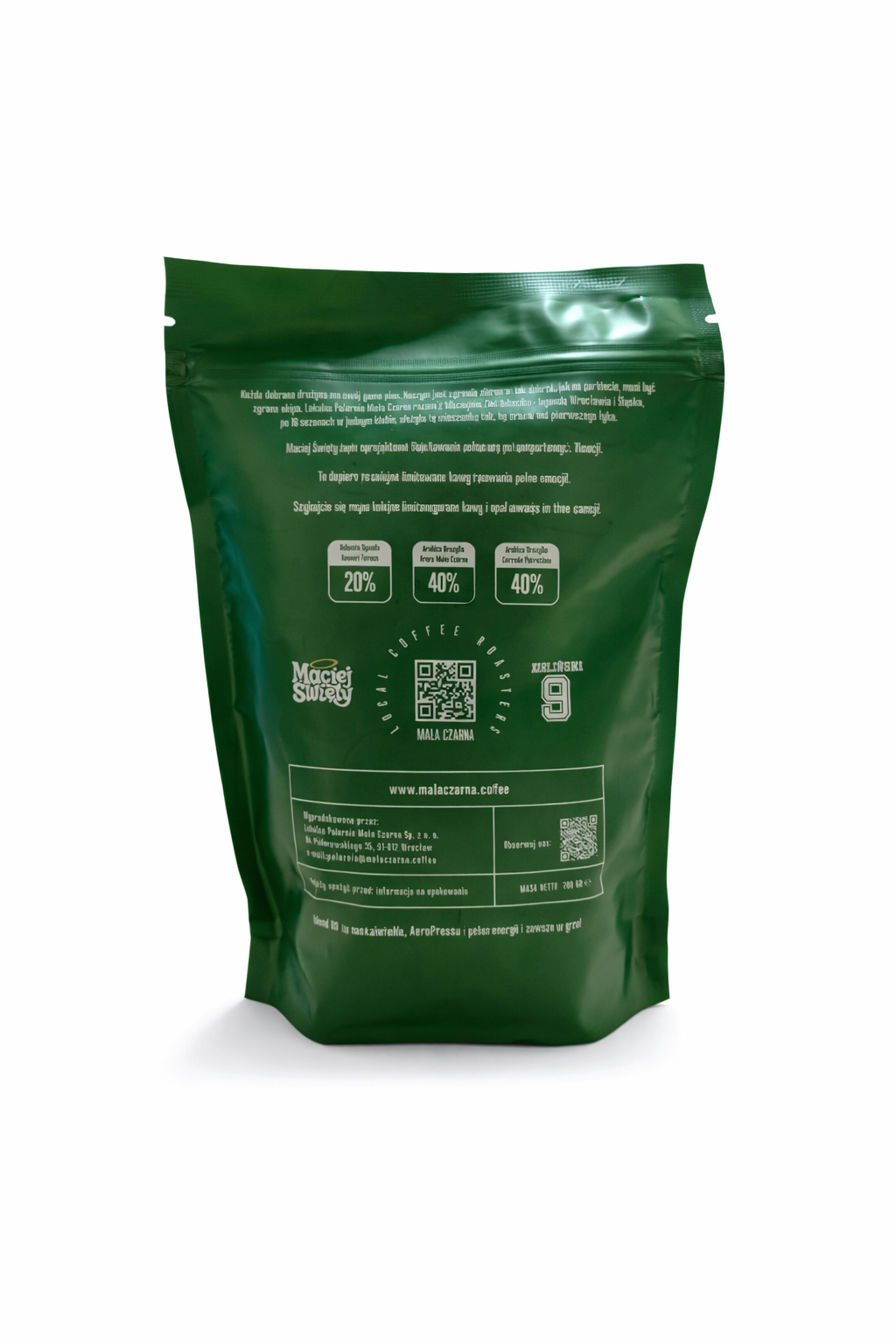 Blend #9 to nasz kawowy triple-double: 40% Brazylii Arary, 40% Brazylii Cerrado, 20% robusty z Ugandy – wybrany przez Zielonego Kapitana Śląska Wrocław, Macieja Zielińskiego.